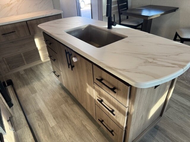 - Factory-installed refrigerator sized to the floorplan (residential-style or high-capacity RV refrigerator depending on factory configuration).