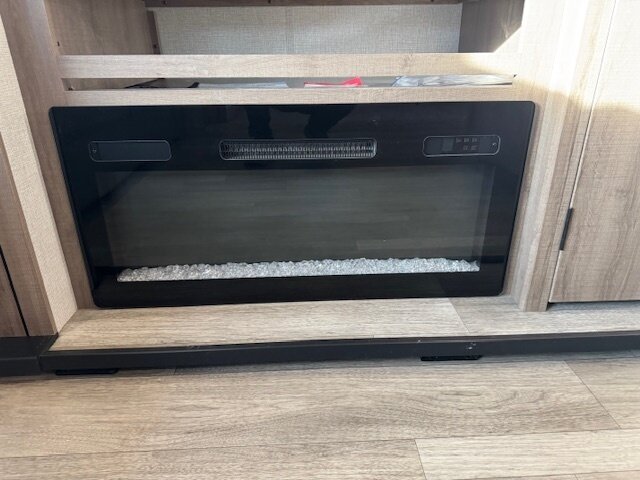 - Integrated entertainment center with factory-mounted LED television prep and cable/satellite hookups; electric fireplace installed beneath or near the entertainment center on the rear wall.